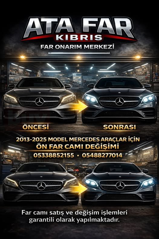 2013–2025 model Mercedes araçlar için ön far camı satış ve değişim hizmeti profesyonel olarak sunulmaktadır. Zamanla matlaşan, sararan veya hasar gören far camları hem ışık performansını düşürür hem de aracın görünümünü olumsuz etkiler. Ata Far Kıbrıs Far Onarım Merkezi olarak, orijinal uyumlu ve yüksek şeffaflığa sahip far camlarıyla aracınızın aydınlatma gücünü yeniliyoruz. Öncesi ve sonrası farkı net şekilde görülen uygulamalarımız garantili olarak yapılmakta, hem estetik hem de sürüş güvenliği açısından kalıcı çözümler sağlanmaktadır.