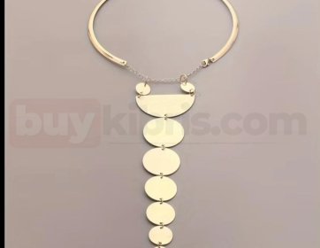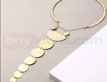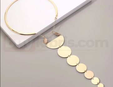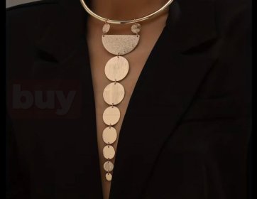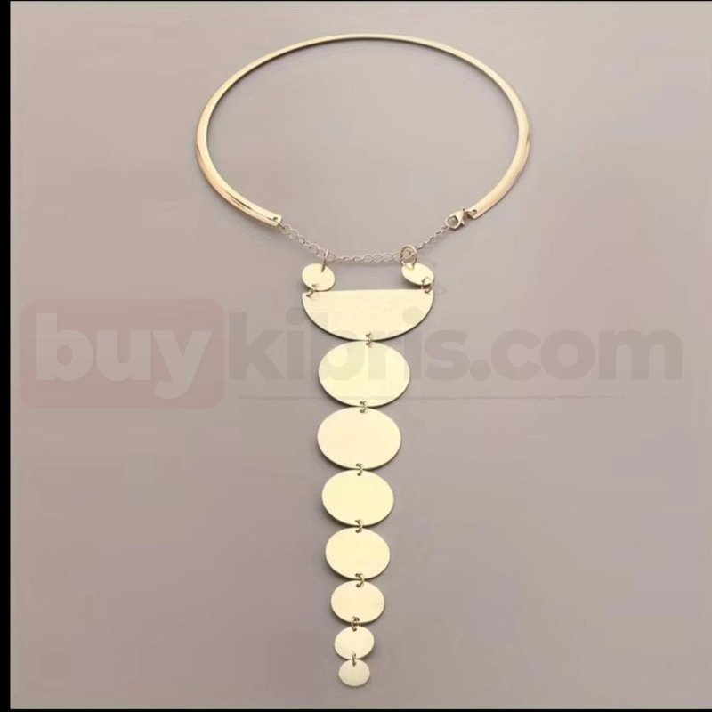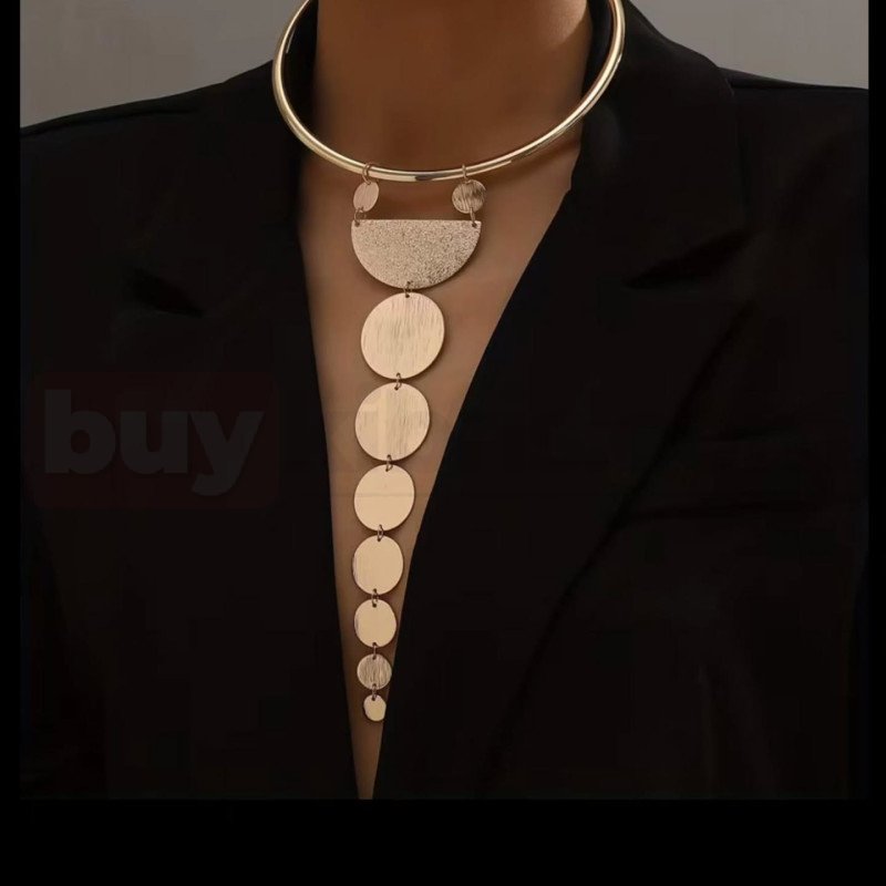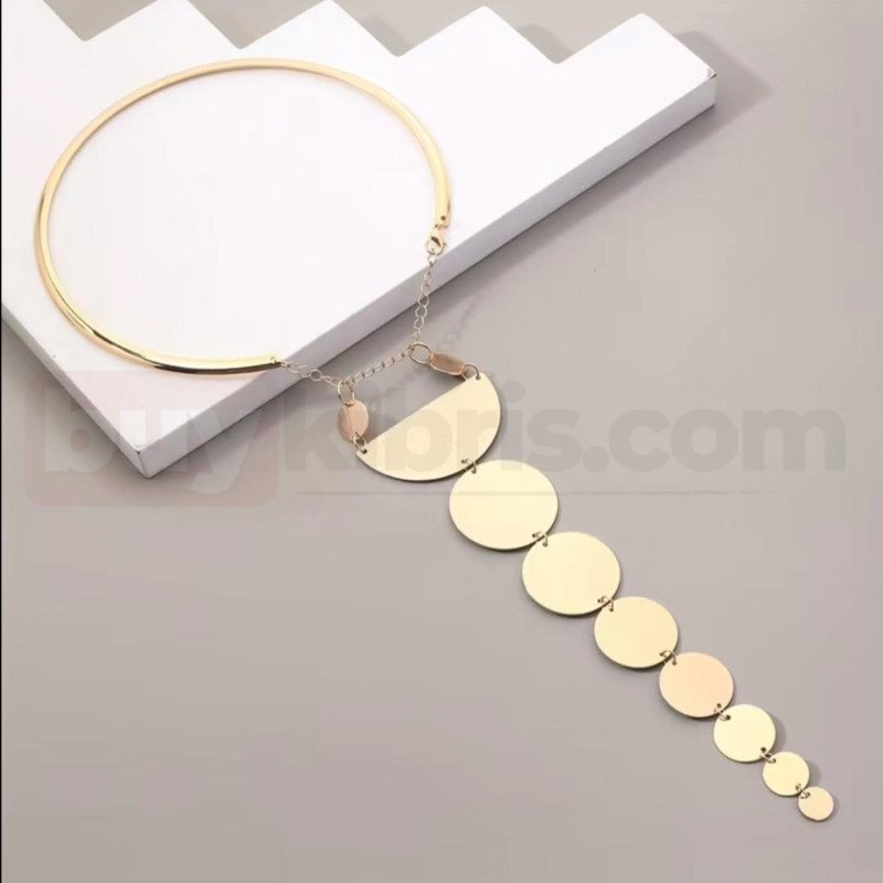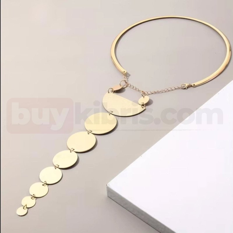 Modern ve güçlü tasarımıyla öne çıkan geometrik plaka detaylı gold kolye modeli, sade şıklığı iddialı bir form ile buluşturur. Kalın ve sabit formdaki boyun halkası, boynu zarif bir şekilde sararak tok ve net bir görünüm oluşturur. Ön kısmında yer alan yarım daire ve alt alta sıralanmış farklı boyutlardaki yuvarlak plakalar ise tasarıma hareket ve derinlik katar.