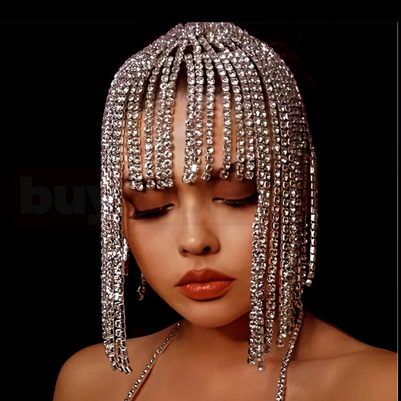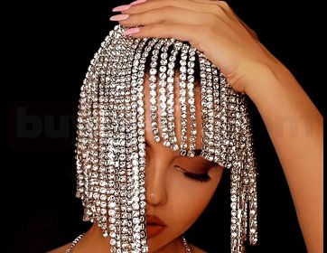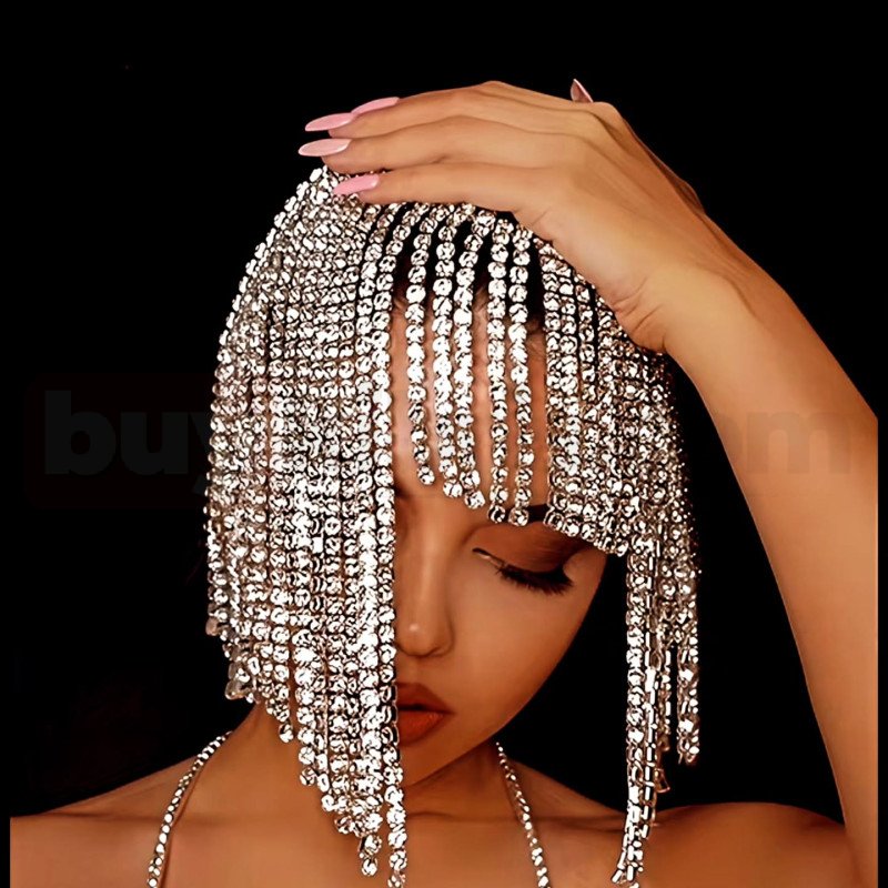 Ön kısımda yer alan yoğun taş püsküller, saça modern ve dramatik bir hava katarken, yanlara doğru uzanan zincir detaylar yüz formunu belirginleştirir. Özellikle gece davetleri, sahne performansları, çekimler ve konsept kombinler için ideal bir aksesuardır.
