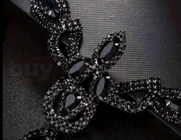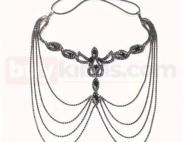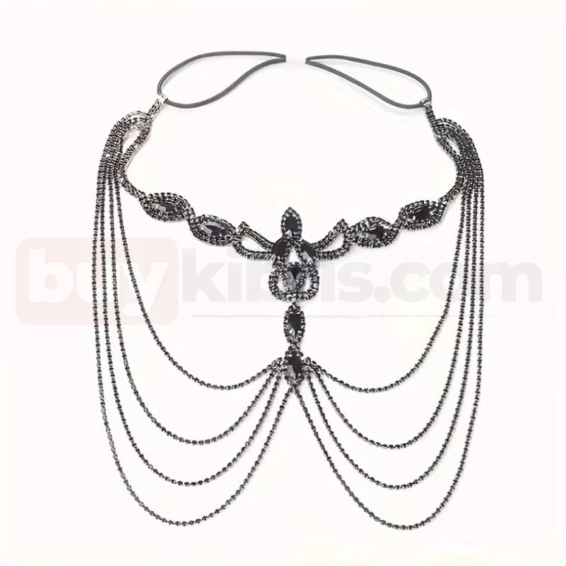 Yan bölümlerde katmanlı şekilde sarkan zincir detayları, tasarıma hacim ve hareket kazandırır. Siyah kristal taşların yoğun dizilimi ışığı yumuşak biçimde yansıtarak gizemli bir parlaklık sağlar. Özellikle konsept çekimler, sahne performansları, defileler ve temalı organizasyonlar için etkileyici bir tamamlayıcıdır.
