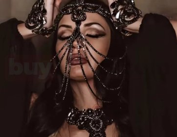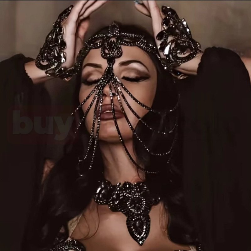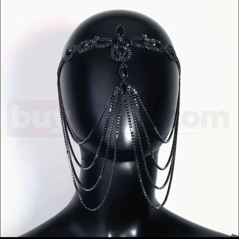 Gotik ve dramatik tasarımıyla öne çıkan siyah taşlı zincir detaylı yüz aksesuarı, güçlü ve iddialı bir stil sunar. Alın kısmına yerleşen taş işlemeli üst bant, merkezde yer alan büyük siyah taş detayıyla dikkat çeker. Bu merkez formdan aşağı doğru inen ince zincirler, yüzü zarif bir şekilde çerçeveler ve maskemsi bir görünüm oluşturur.