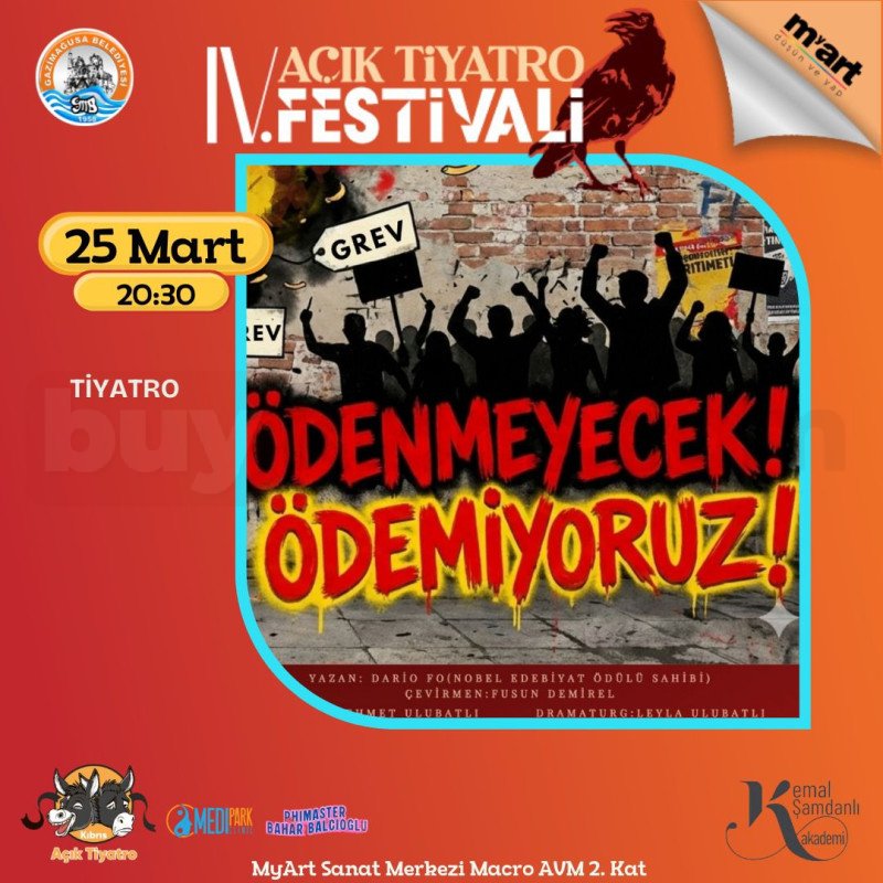 Toplumsal eleştiriyi mizahla harmanlayan “Ödenmeyecek Ödemiyoruz” 25 Mart saat 20:30’da sahnede. Güçlü metni ve dinamik sahne kurgusuyla izleyiciyi düşündürürken güldüren bu oyun, festival programının dikkat çeken yapımlarından biri. Gösterim MyArt Sanat Merkezi Macro AVM 2. Kat’ta gerçekleştirilecektir.