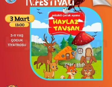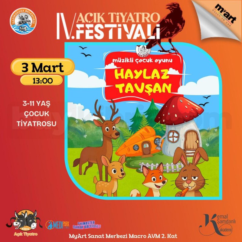 “Haylaz Tavşan” müzikli çocuk oyunu 3 Mart saat 13:00’te sahnede. Eğlenceli karakterleri ve müzikli anlatımıyla çocuklara hem eğitici hem de keyifli anlar yaşatacak bu gösteri, 3-11 yaş arası minik tiyatroseverler için hazırlanmıştır. Gösteri MyArt Sanat Merkezi Macro AVM 2. Kat’ta izlenebilir.