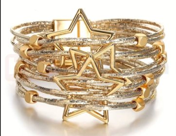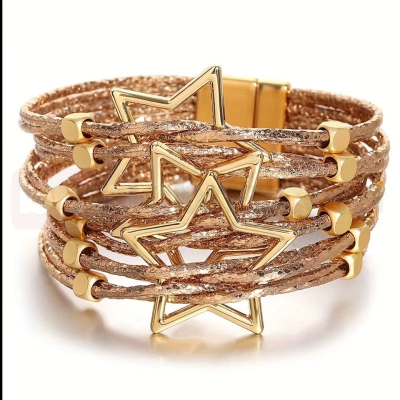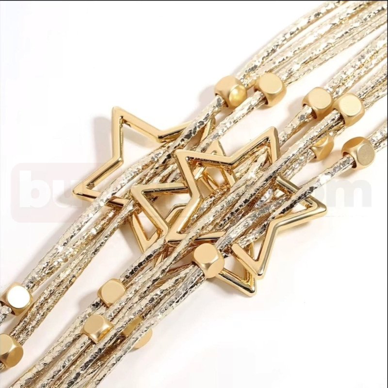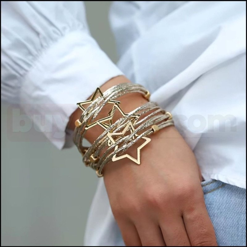 Şık ve dikkat çekici tasarımıyla öne çıkan bu altın renk yıldız detaylı çoklu sarmal bileklik, modern ve iddialı bir stil arayanlar için tasarlanmıştır. Birden fazla ince ip formunun bir araya gelmesiyle oluşturulan sarmal yapı, bilekte dolgun ve gösterişli bir görünüm sağlar. Ortada yer alan iç içe geçmiş yıldız figürleri tasarıma hem hareket hem de güçlü bir karakter kazandırır.