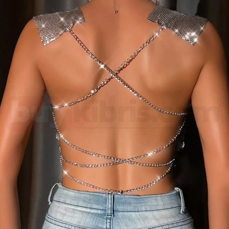 Gümüş Metal Zincir Detaylı Parlak Crop Bluz | buykibris.com