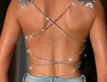 Metal zincir dokulu yüzeyiyle tasarlanan bu parlak crop bluz, ışığı yansıtan yapısı sayesinde dikkat çekici ve iddialı bir stil sunar. Ön kısmındaki dökümlü kesim feminen bir görünüm sağlarken, sırt kısmındaki çapraz zincir detayları tasarıma modern ve cesur bir hava katar.