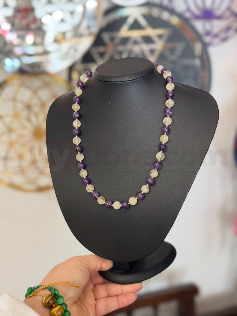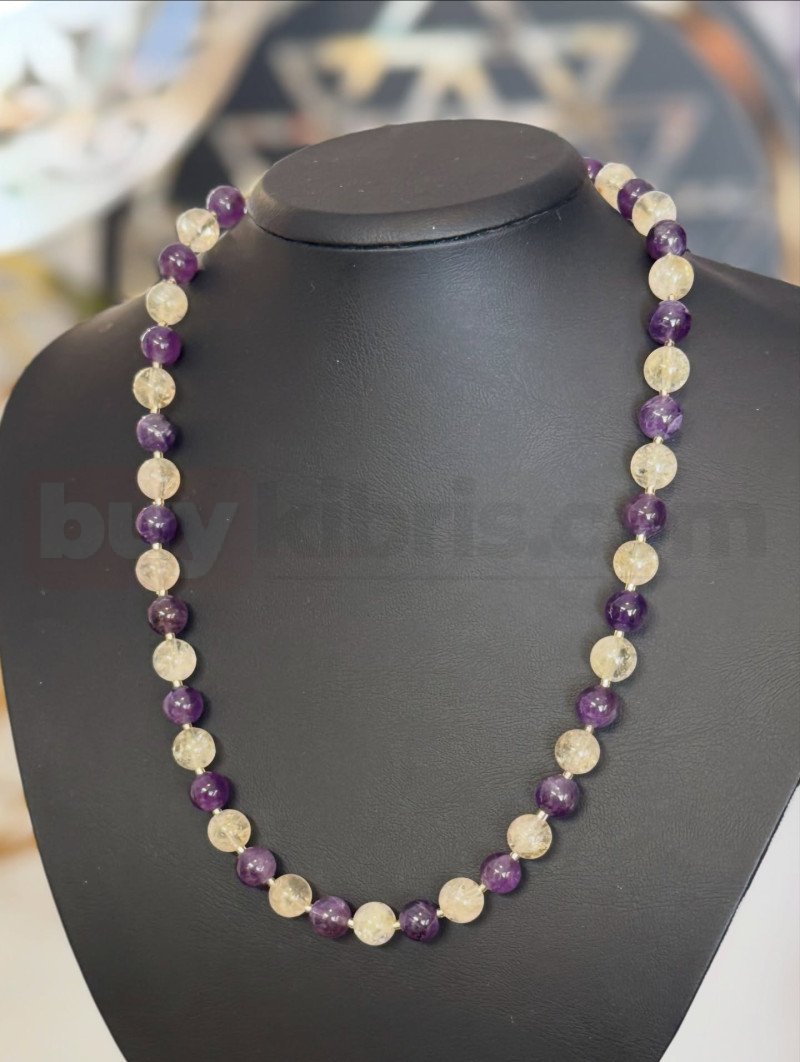 Ametist ve sitrinin bir araya geldiği bu özel kolye, enerjisel olarak hem ruhu sakinleştiren hem de yaşam enerjisini yükselten güçlü bir uyum taşır. Morun dinginliği ile sarının canlılığı birleşerek taşıyana hem iç huzur hem de motivasyon kazandırır.