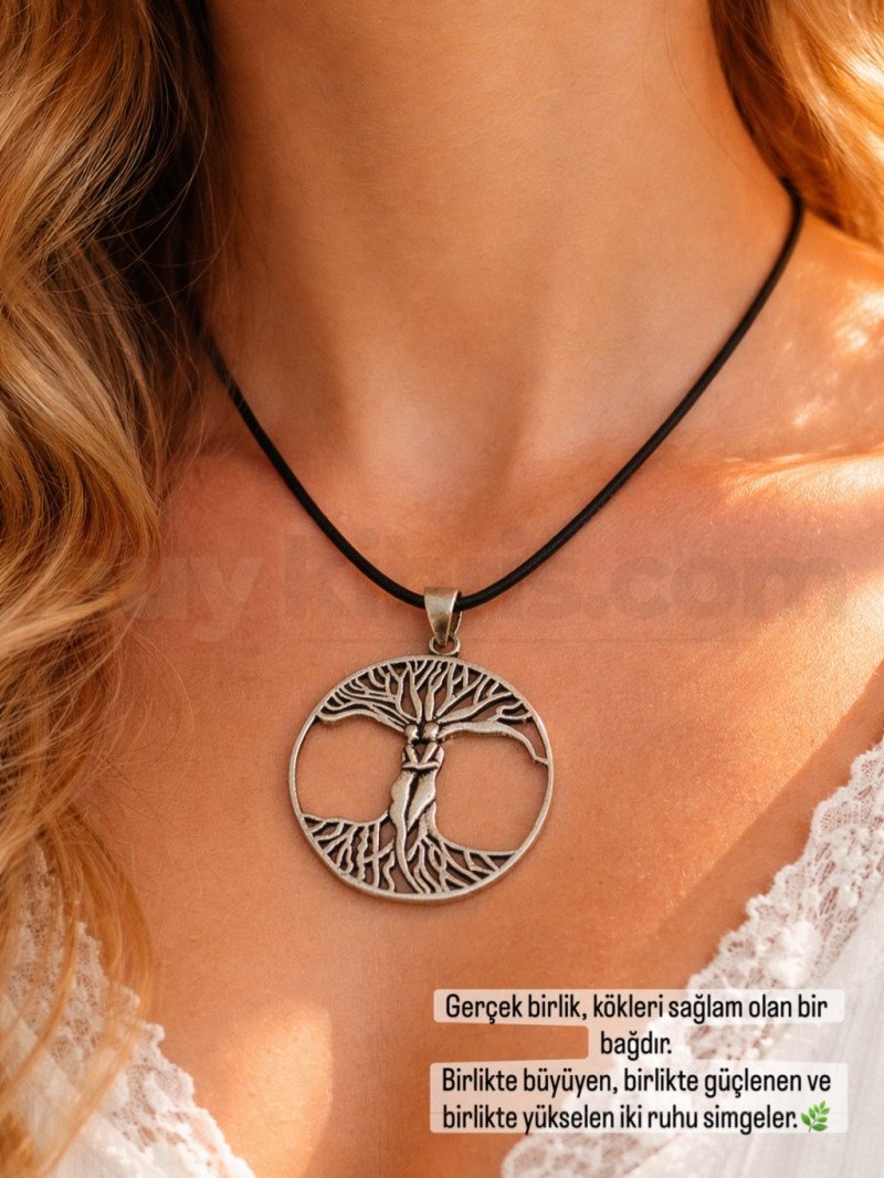 Hayat ağacı kökleriyle toprağa, dallarıyla göğe uzanırken; kadın ve erkek figürü bu iki zıt ama tamamlayıcı gücün tam merkezde buluştuğunu anlatır. Dişil enerji sezgiyi, şefkati, yaratımı ve akışı simgelerken; eril enerji gücü, iradeyi, korumayı ve yön vermeyi temsil eder. Bu kolyede iki figürün ağacın kalbinde birleşmesi, evrenin dengesinin sevgiyle kurulduğunu fısıldar.