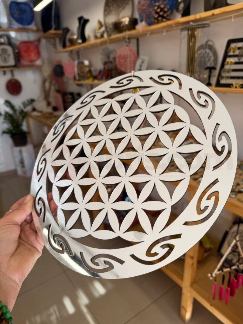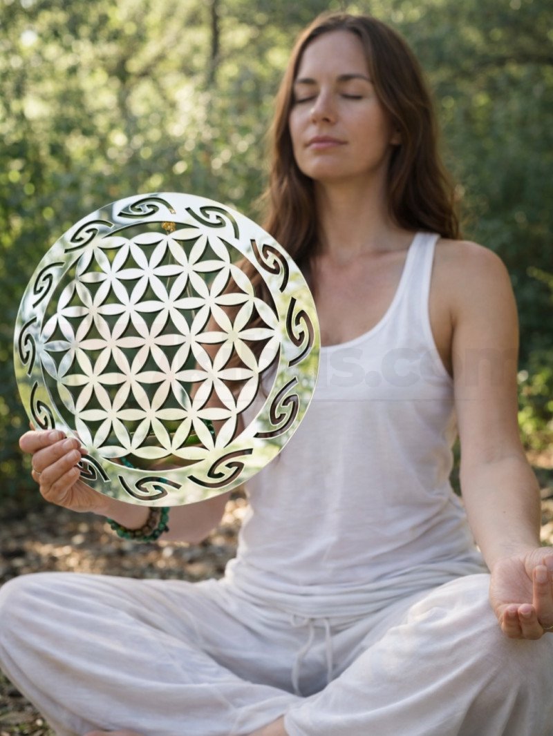 Yaşam Çiçeği’nin kutsal geometrisi, evrendeki sınırsız akışı simgeler. Elinde tuttuğunda, “Ben bolluğa layığım” niyetini kalbinden geçir. Aynalı yüzey, bu niyeti hem sana hem de yaşam alanına yansıtarak bereket kapılarını aralar.