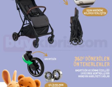 •Katlandığında, bebek arabası son derece sıkı, toplu ve uçakta el bagajı için izin verilen boyutlardadır.
