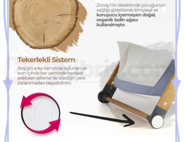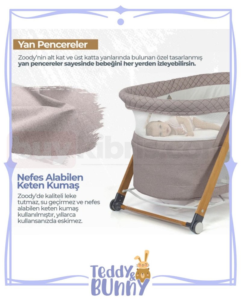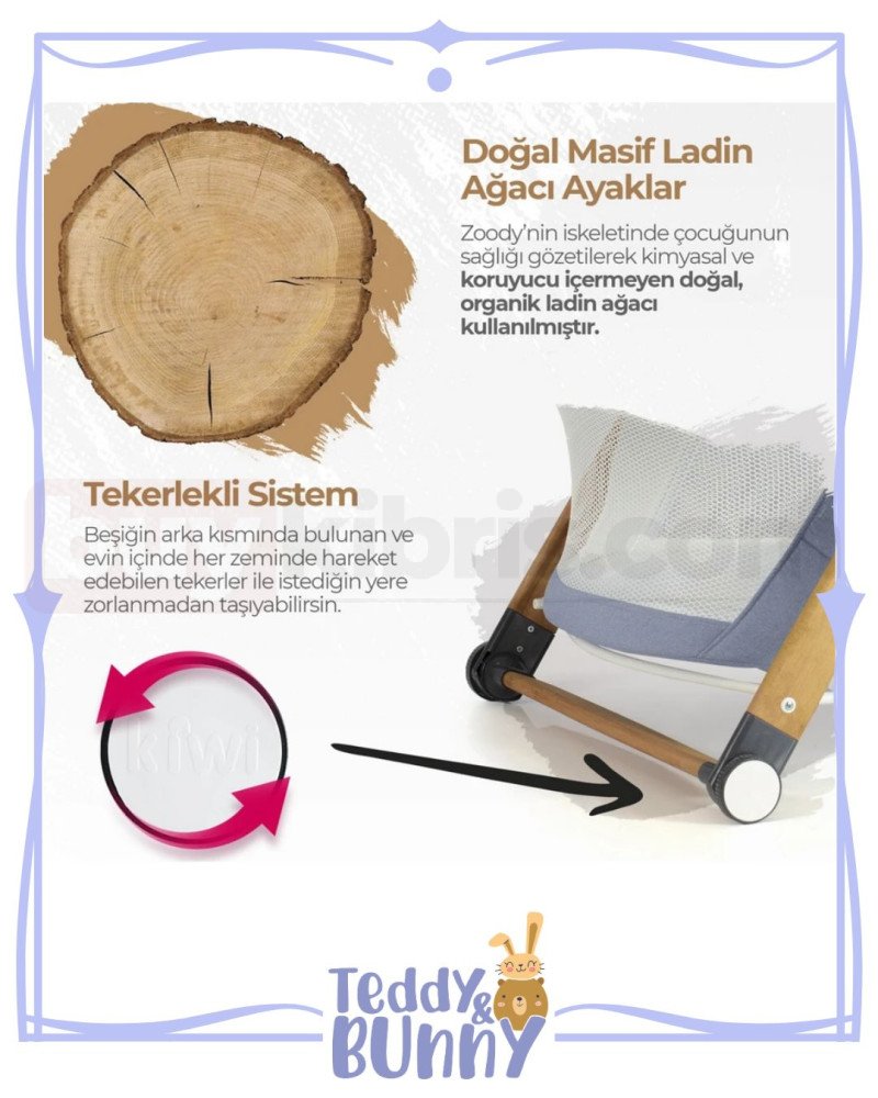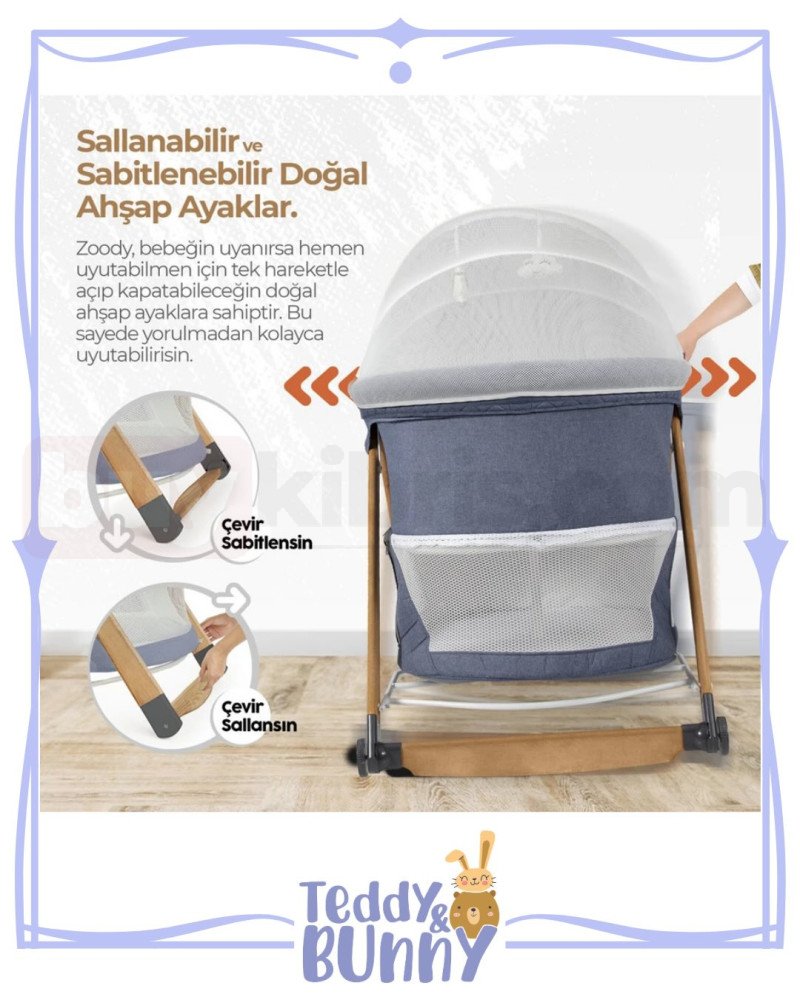 🌟Sallanabilir Ahşap Ayaklar: Sallanan oyun parkı beşik modelleri arasında yer alan Kiwi Zoody, sallanabilir ahşap ayakları sayesinde bebeklerinizi rahatlatır.