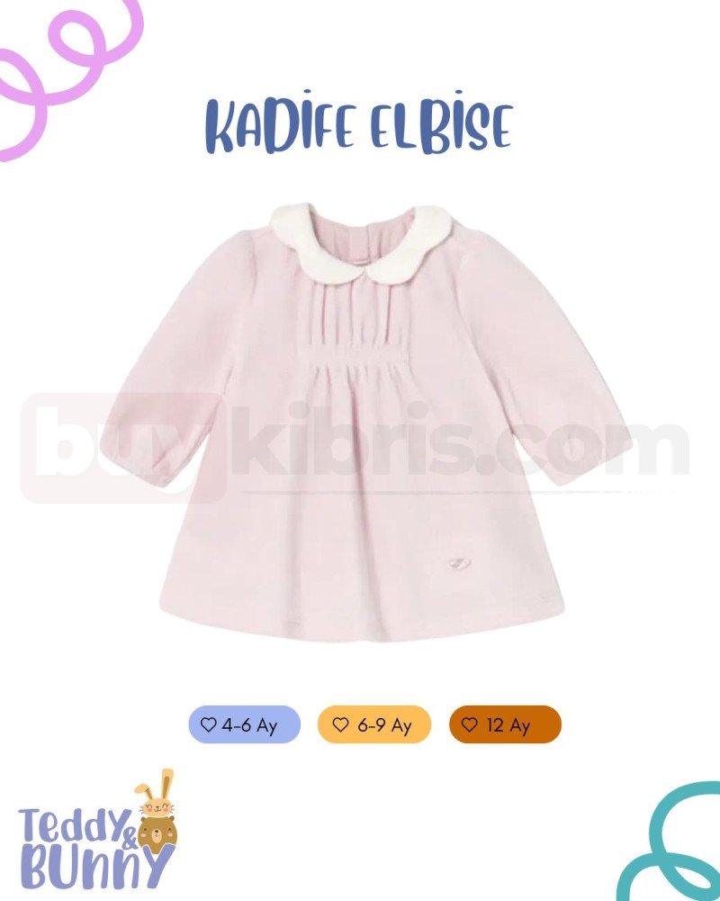 Yumuşak kadife kumaşı ve zarif tasarımıyla bebeğiniz için şık bir elbise seçeneğidir. Özel günlerde ve günlük kullanımda rahatlıkla tercih edilebilir.