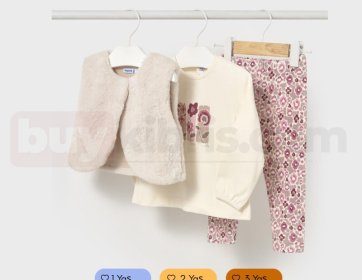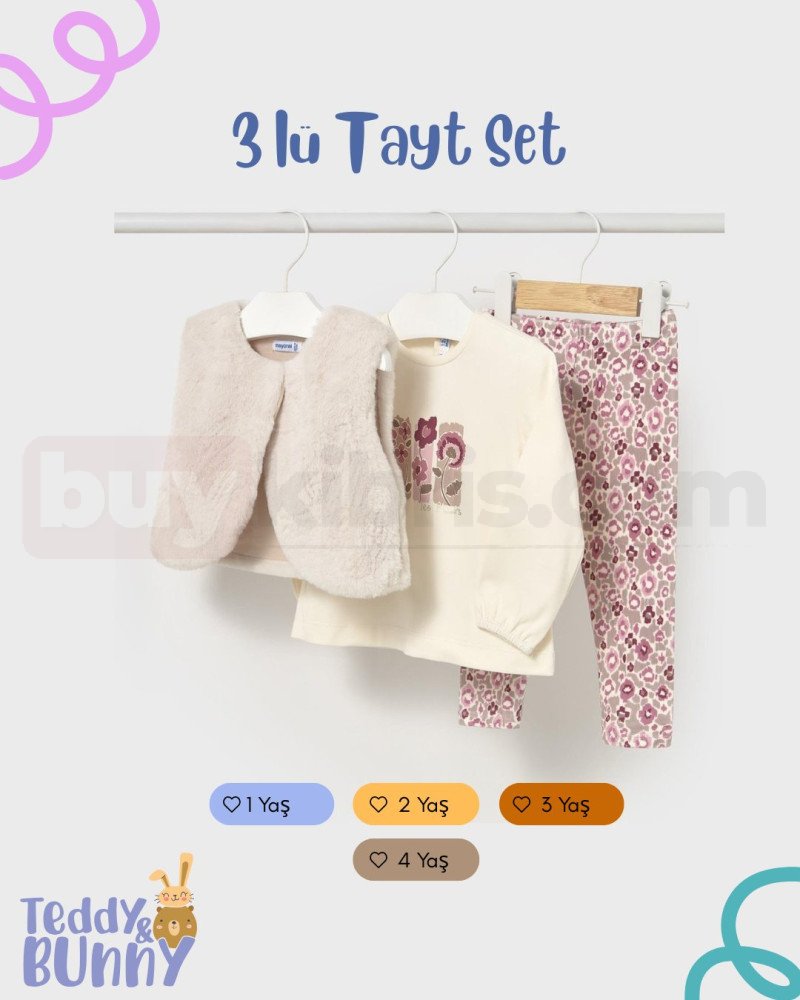 Yelek, üst ve tayttan oluşan üç parçalı kombin çocuklar için hem rahat hem de şık bir seçenektir. Günlük kullanımda hareket özgürlüğü sağlayan konforlu bir settir.