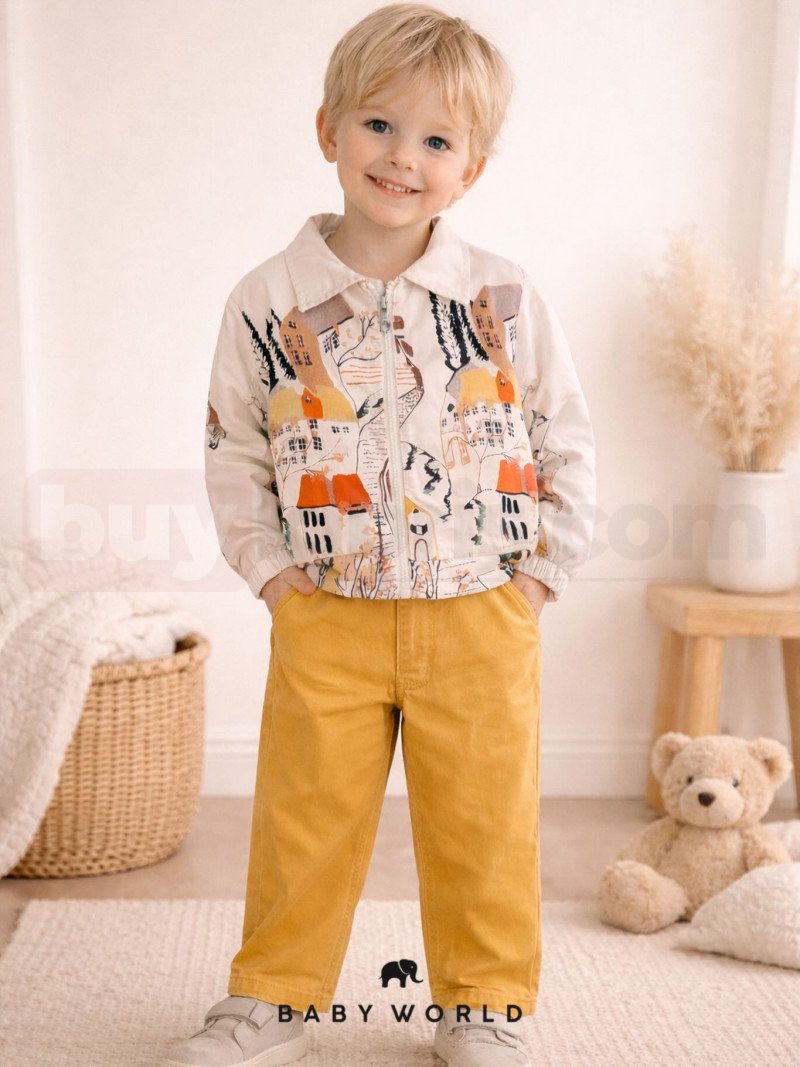 Renkli ve eğlenceli desenlere sahip bu çocuk ceketi, günlük kombinlere hareketli bir tarz katmak için tasarlanmıştır. Rahat kesimi ve kaliteli kumaşı sayesinde çocuklar gün boyu özgürce hareket edebilir. Baby World kalitesiyle sunulan bu kombin, hem şık hem de kullanışlı bir stil oluşturur.