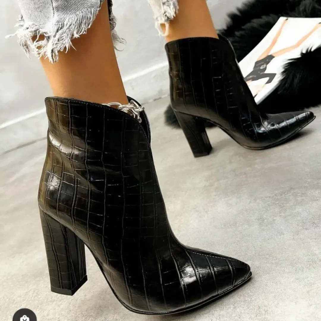 Kroko desenli yüzeyiyle modern ve şık bir görünüm sunan kadın bot modeli. Sivri burun ve yüksek topuk tasarımı sayesinde zarif bir stil oluşturur.