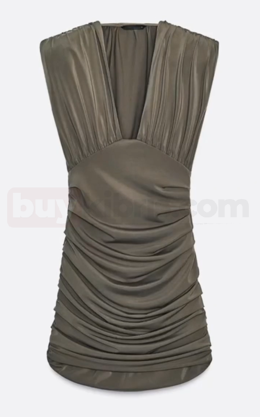 Şık ve modern tasarımıyla dikkat çeken drapeli V yaka mini elbise, feminen bir görünüm sunan özel bir parçadır. Derin V yaka detayı ve vücuda uyum sağlayan drapeli kesimi sayesinde zarif bir siluet oluşturur. Yumuşak ve akıcı kumaşı ile hem konforlu hem de şık bir kullanım sağlar. Özel davetlerde, akşam organizasyonlarında veya şık kombinlerde tercih edilebilecek bu elbise, topuklu ayakkabı ve minimal aksesuarlarla tamamlandığında oldukça etkileyici bir stil oluşturur.