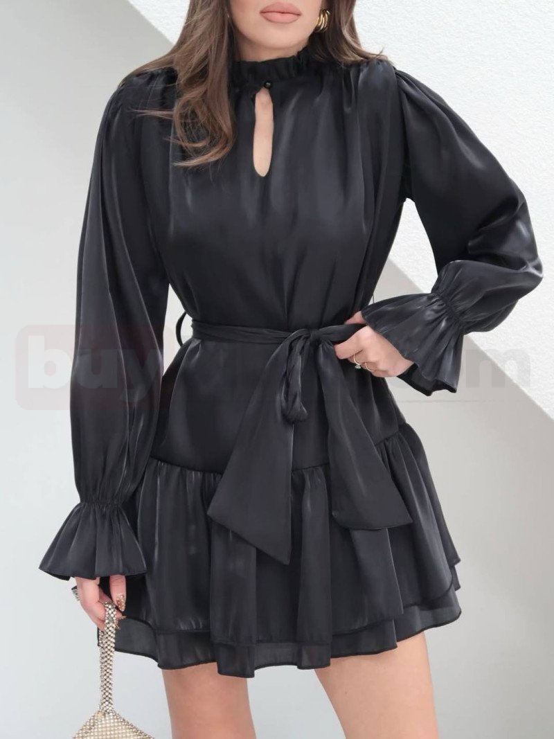 Hafif ve akışkan şifon kumaşıyla zarif bir görünüm sunan bu siyah mini elbise, belden bağlamalı kuşak detayıyla feminen bir siluet oluşturur. Fırfırlı etek ve kol detayları hareketli ve şık bir hava katarken, boğaz kısmındaki ince açıklık modern bir dokunuş sağlar. Günlük şıklıkta ya da özel davetlerde rahatlıkla tercih edilebilecek, zarif ve dikkat çekici bir parça.
