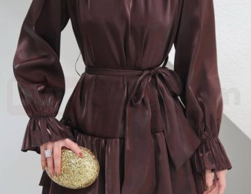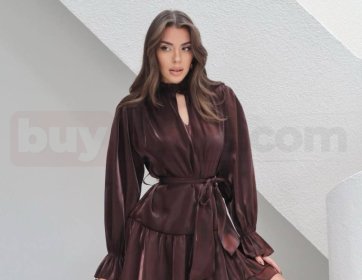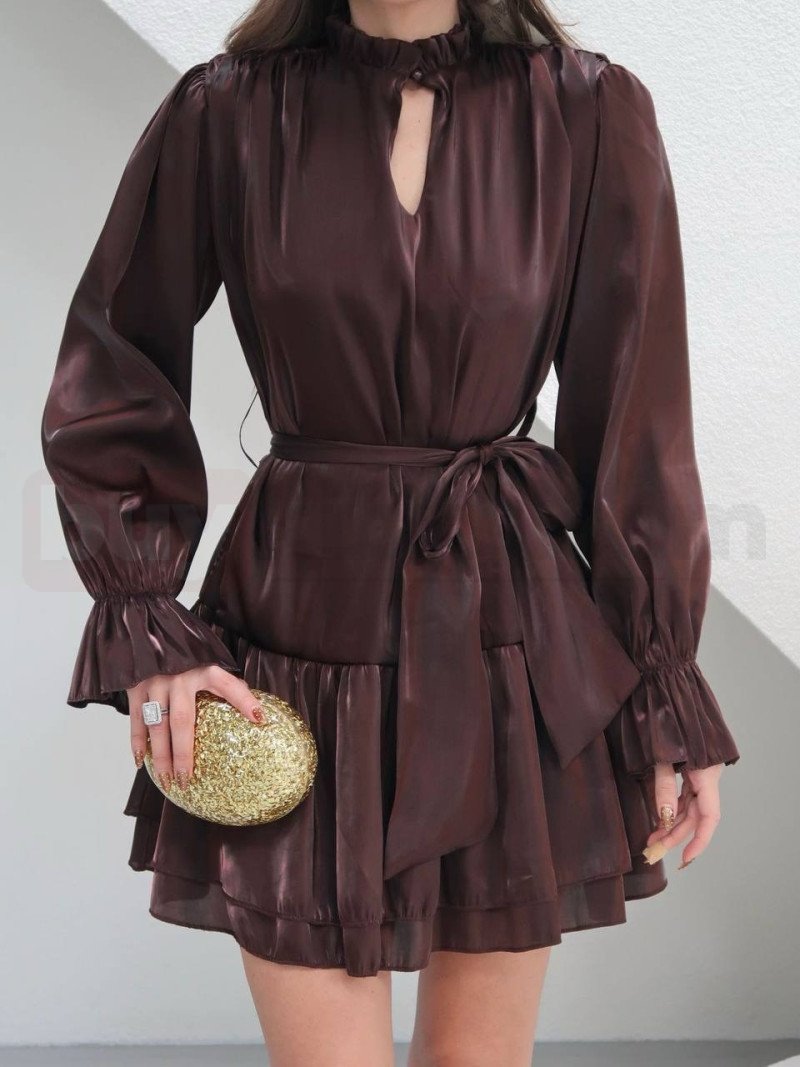 Işıltılı saten dokusuyla dikkat çeken bu kahverengi mini elbise, zarif ve iddialı bir stil sunar. Belden bağlamalı kuşak detayı vücut formunu ön plana çıkarırken, hafif dökümlü yapısı ve hareketli etek kesimi feminen bir görünüm sağlar. Özel davetler ve şık akşam kombinleri için ideal, sofistike bir parçadır.