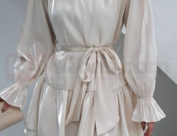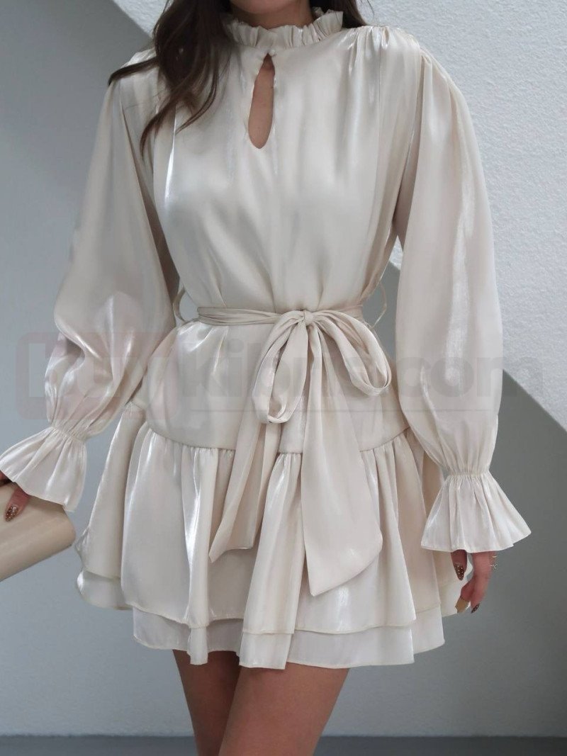 Zarif krem tonu ve parlak saten dokusuyla öne çıkan bu mini elbise, şıklığı sade bir zarafetle buluşturur. Belden bağlamalı kuşak detayı vücudu nazikçe sararken, fırfırlı etek ve kol uçları romantik bir hava katar. Özel günler, davetler ve şık kombinler için ideal olan bu parça, feminen stilin en zarif yansımasıdır.