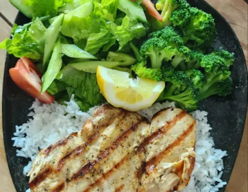 250 gr. piliç göğüs fileto, 100 gr. jasmine pirinç, 60 gr. brokoli mix ve yeşillik (836 kcal.)