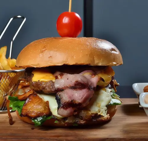 180 gr. dana eti, spesiyal burger sosu, karamelize soğan, kırmızı cheddar peyniri, marul, domates, mantar, dana bacon, yumurta. Patates kızartması ile