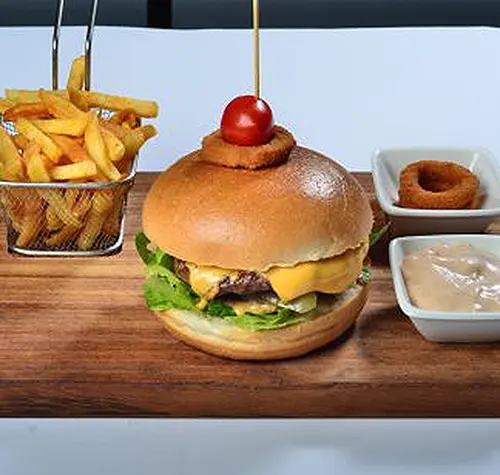 180 gr. dana eti, karamelize soğan, peynir, domates, marul. Patates kızartması, spesiyal burger sos ile