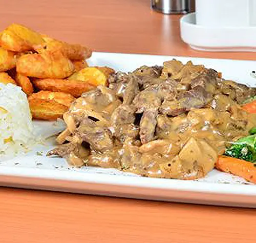 Jülyen dana eti, krema, demi glace sos. Patates kızartması, mevsim sebzeleri, pilav ile