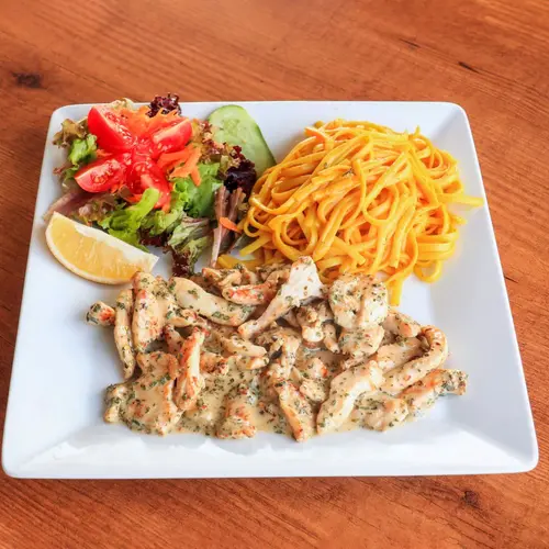 250 gr. sarımsak kekikle marine edilmiş tavuk göğsü, pesto sos. Makarna, salata ile