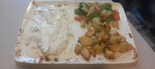 Tavuk göğüs, krema, mantar, soğan. Patates kızartması, sote sebzeler ile