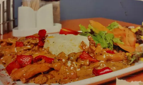 Jülyen tavuk, krema, mantar, soya sos, kapya biberi. Pilav, salata ile
