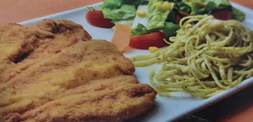 Panelenmiş tavuk göğüs. Spaghetti, salata ile
