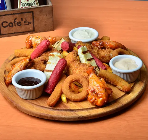 Çıtır tavuk kanatları, çıtır mozzarella sticks, tavuk tenders, dana sosis, soğan halkası, patates kızartması, ızgara hellim peyniri