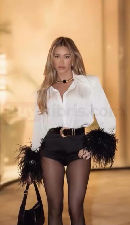 Şık ve iddialı bir görünüm sunan bu kombin, beyaz klasik kesim gömlek ve siyah yüksek bel şorttan oluşmaktadır. Gömleğin kol uçlarında yer alan tüy detayları tasarıma hareket ve dikkat çekici bir stil kazandırırken, şort ile birlikte dengeli ve zarif bir siluet oluşturur.
