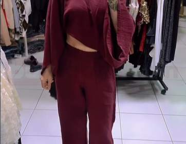 Şık ve özgün tasarımıyla öne çıkan bu takım, bordo tonlarında asimetrik kesim bluz ve uyumlu pantolondan oluşmaktadır. Tek omuz detaylı bluz ve bel kısmındaki kesik form, kombine modern ve dikkat çekici bir hava katarken; bol kesim pantolon rahat bir kullanım sunar.