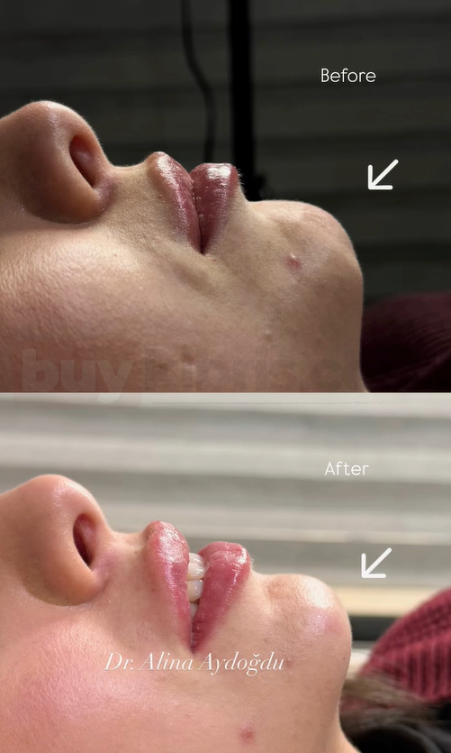 Dr. Alina Aydoğdu tarafından uygulanan dudak dolgusu işlemi, dudakların doğal yapısını bozmadan hacim kazandırmayı ve yüz ile uyumlu bir form oluşturmayı hedefler. Öncesi ve sonrası karşılaştırmasında da görüldüğü üzere, dudak konturu daha belirgin hale getirilirken üst dudak projeksiyonu dengelenmiş ve dudaklar daha estetik bir profile kavuşmuştur.