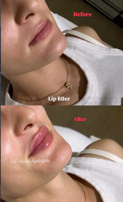 Dr. Alina Aydoğdu tarafından uygulanan dudak dolgusu işlemi, dudaklara kontrollü hacim kazandırarak doğal ve dengeli bir görünüm elde edilmesini sağlar. Öncesi ve sonrası karşılaştırmasında, dudakların daha dolgun hale geldiği, konturunun belirginleştiği ve genel ifadenin daha canlı bir görünüm kazandığı açıkça görülmektedir.