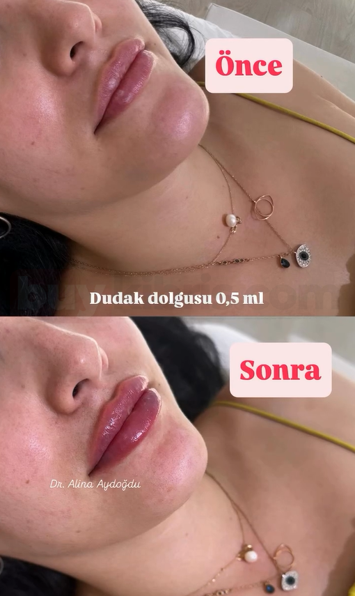 Dr. Alina Aydoğdu tarafından uygulanan 0.5 ml dudak dolgusu, minimal dokunuşlarla doğal bir hacim artışı sağlamak isteyen kişiler için ideal bir çözümdür. Öncesi ve sonrası karşılaştırmasında, dudakların hafifçe dolgunlaştığı, konturunun belirginleştiği ve genel görünümün daha canlı hale geldiği görülmektedir.