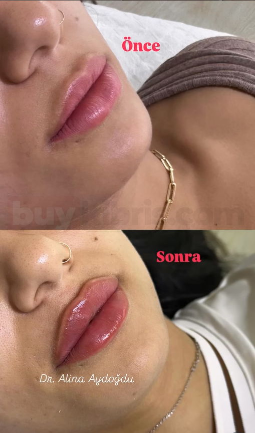 Dr. Alina Aydoğdu tarafından uygulanan dudak dolgusu işlemi, dudaklara hacim kazandırırken doğal dengeyi korumayı hedefler. Öncesi ve sonrası karşılaştırmasında, dudakların daha dolgun hale geldiği, konturunun belirginleştiği ve genel görünümün daha estetik bir forma kavuştuğu görülmektedir.