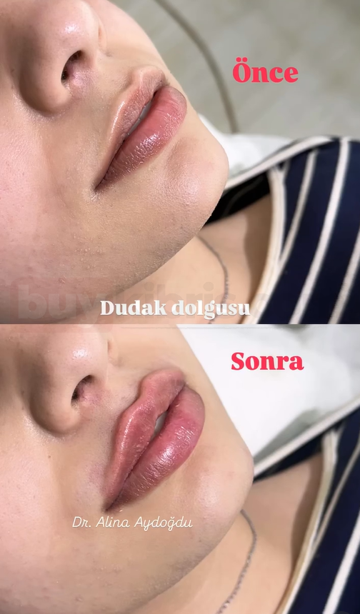 Dr. Alina Aydoğdu tarafından uygulanan dudak dolgusu işlemi, dudaklara doğal bir hacim kazandırarak daha estetik ve dengeli bir görünüm elde edilmesini sağlar. Öncesi ve sonrası karşılaştırmasında, dudakların dolgunlaştığı, konturunun belirginleştiği ve genel görünümün daha canlı hale geldiği açıkça görülmektedir.