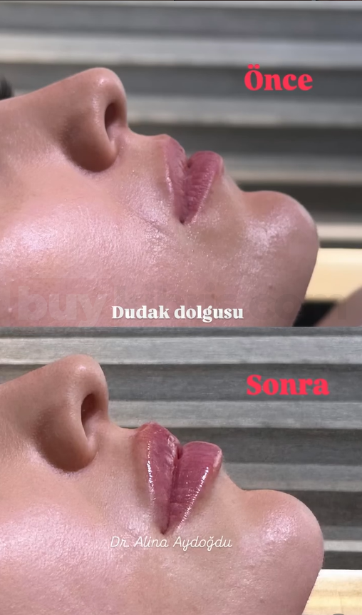 Dr. Alina Aydoğdu tarafından uygulanan dudak dolgusu işlemi, dudaklara hacim kazandırırken özellikle yan profilde daha belirgin ve estetik bir görünüm oluşturur. Öncesi ve sonrası karşılaştırmasında, dudak projeksiyonunun arttığı, üst dudak hattının daha net hale geldiği ve genel profilin daha dengeli bir yapıya kavuştuğu görülmektedir.