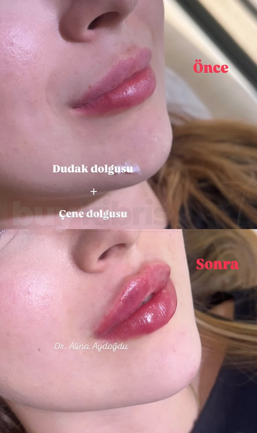 Dr. Alina Aydoğdu tarafından uygulanan dudak ve çene dolgusu kombinasyonu, yüz hatlarını bütünsel olarak dengelemeyi ve daha estetik bir görünüm oluşturmayı amaçlar. Öncesi ve sonrası karşılaştırmasında, dudakların dolgunlaştığı, çene hattının belirginleştiği ve genel yüz profilinin daha uyumlu hale geldiği görülmektedir.