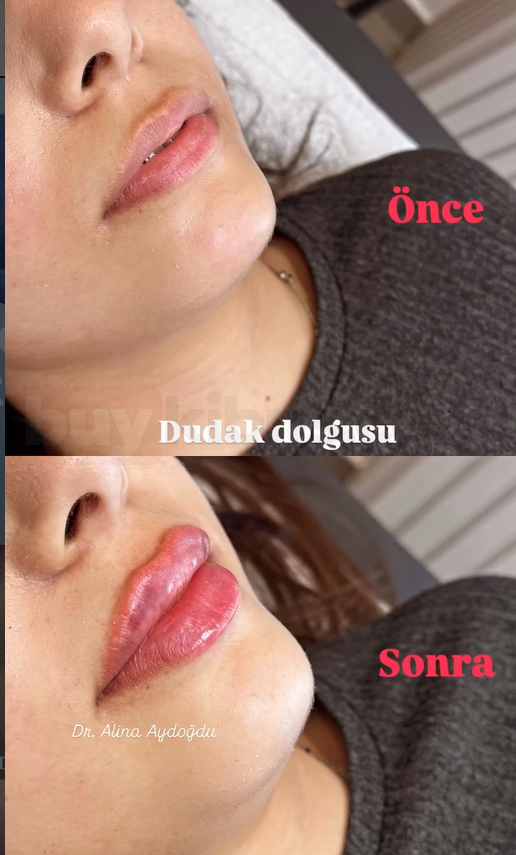 Dr. Alina Aydoğdu tarafından uygulanan dudak dolgusu işlemi, dudaklara hacim kazandırırken kontur hattını belirginleştirerek daha estetik bir görünüm sağlar. Öncesi ve sonrası karşılaştırmasında, dudakların belirgin şekilde dolgunlaştığı, üst dudak hattının netleştiği ve genel görünümün daha canlı hale geldiği görülmektedir.