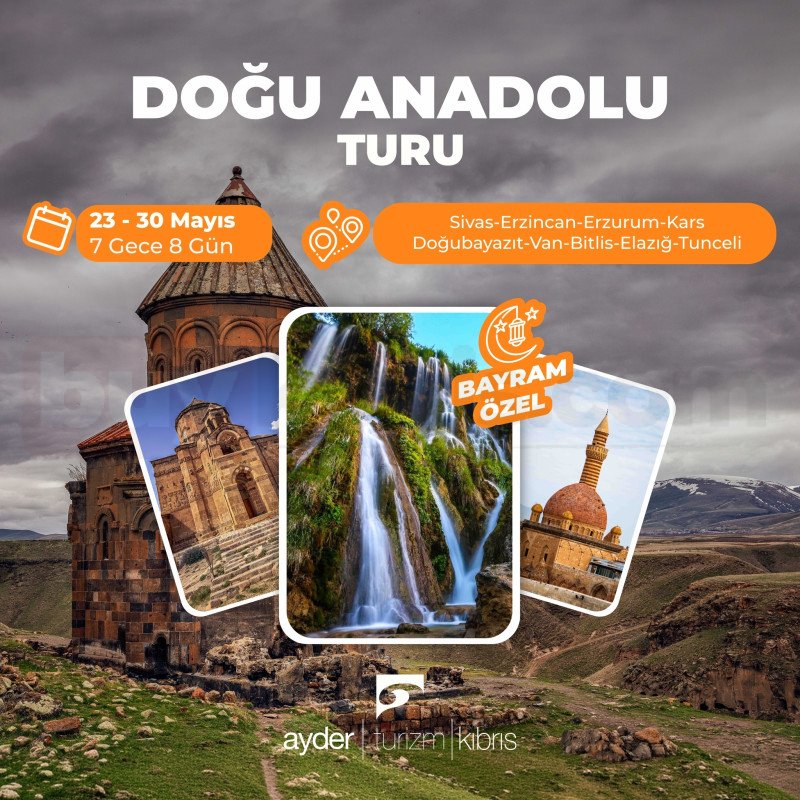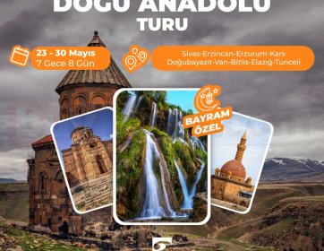 Doğu Anadolu’nun tarihi şehirleri ve doğal güzelliklerini kapsayan bu özel turda eşsiz bir keşif yolculuğu sizi bekliyor. Sivas’tan Kars’a, Van’dan Tunceli’ye uzanan rotada kültür, tarih ve doğa bir arada sunuluyor. 23-30 Mayıs tarihleri arasında 7 gece 8 gün sürecek bayrama özel bu turu kaçırmayın.
