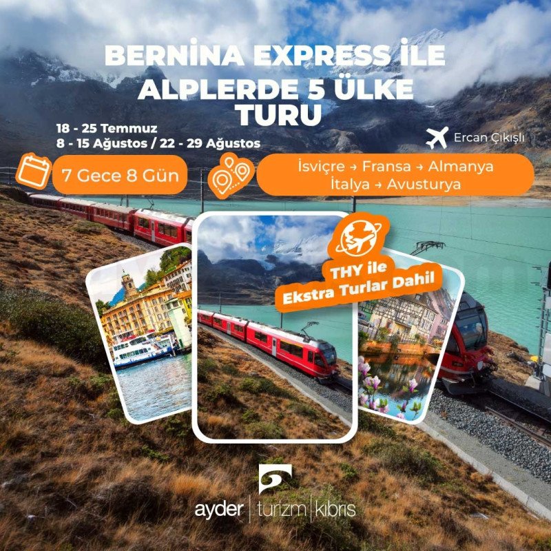 Ayder Turizm Kıbrıs tarafından düzenlenen Alplerde 5 Ülke Turu, 18-25 Temmuz, 8-15 Ağustos ve 22-29 Ağustos tarihlerinde 7 gece 8 gün olarak planlanmıştır. Program, İsviçre, Fransa, Almanya, İtalya ve Avusturya’yı kapsayan geniş bir Avrupa rotası sunar.