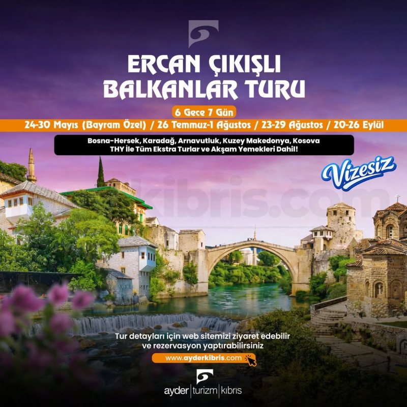 Ayder Turizm Kıbrıs tarafından düzenlenen Balkanlar Turu, 6 gece 7 gün süren kapsamlı bir Avrupa programıdır. 24-30 Mayıs (Bayram özel), 26 Temmuz-1 Ağustos, 23-29 Ağustos ve 20-26 Eylül tarihleri için planlanmıştır.