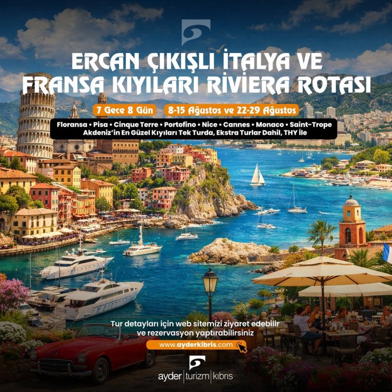 Ayder Turizm Kıbrıs tarafından düzenlenen İtalya ve Fransa Riviera Turu, 7 gece 8 gün süren kapsamlı bir yaz programıdır. 8-15 Ağustos ve 22-29 Ağustos tarihleri için planlanmıştır.