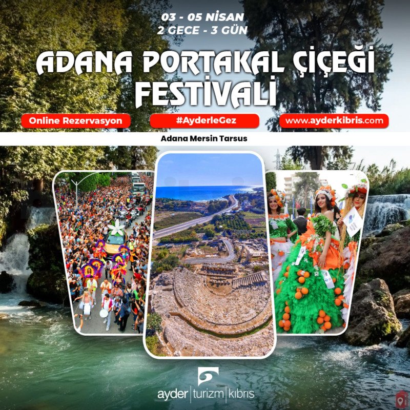 Ayder Turizm Kıbrıs tarafından düzenlenen Adana Portakal Çiçeği Festivali programı, 03-05 Nisan tarihleri arasında 2 gece 3 gün olarak planlanmıştır. Program kapsamında Adana, Mersin ve Tarsus bölgeleri ziyaret edilir.