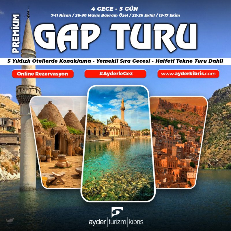 Ayder Turizm Kıbrıs tarafından düzenlenen GAP Turu, 4 gece 5 gün süren planlı bir kültür programıdır. 7-11 Nisan, 26-30 Mayıs (Bayram özel), 22-26 Eylül ve 13-17 Ekim tarihleri için organize edilmiştir.