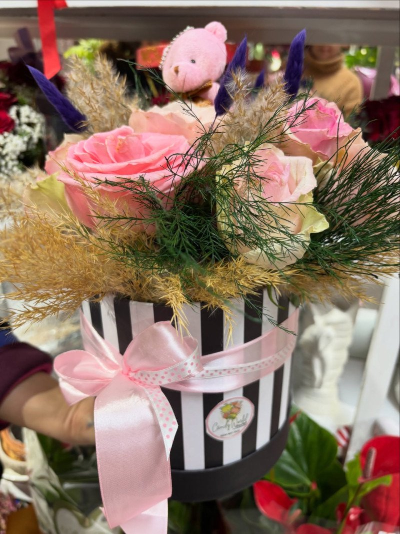 Candy World Çiçek Mağazası’nın zarif tasarımlarından biri olan bu kutu aranjman, pastel tonlardaki pembe güller ve şık detaylarla hazırlanmıştır. Sevimli ayıcık dokunuşu ile hem romantik hem de sıcak bir hediye alternatifi sunan bu özel tasarım, Kıbrıs’ta sevdiklerinizi mutlu etmenin en estetik yollarından biridir. Dekoratif kutusu ve özenli sunumuyla dikkat çeken bu aranjman, Candy World kalitesiyle Kıbrıs genelinde sizlere ulaştırılmaktadır.