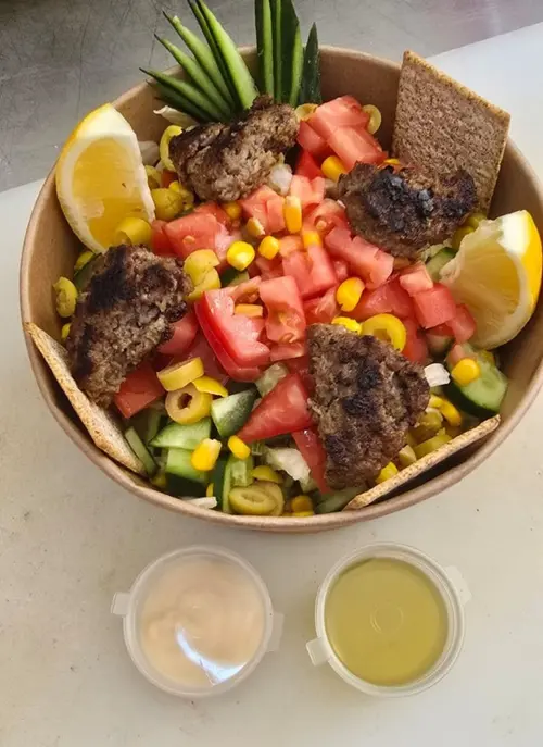 Domates, salatalık, marul, zeytin, ızgara tavuk. Seçeceğiniz sos ile servis edilir.